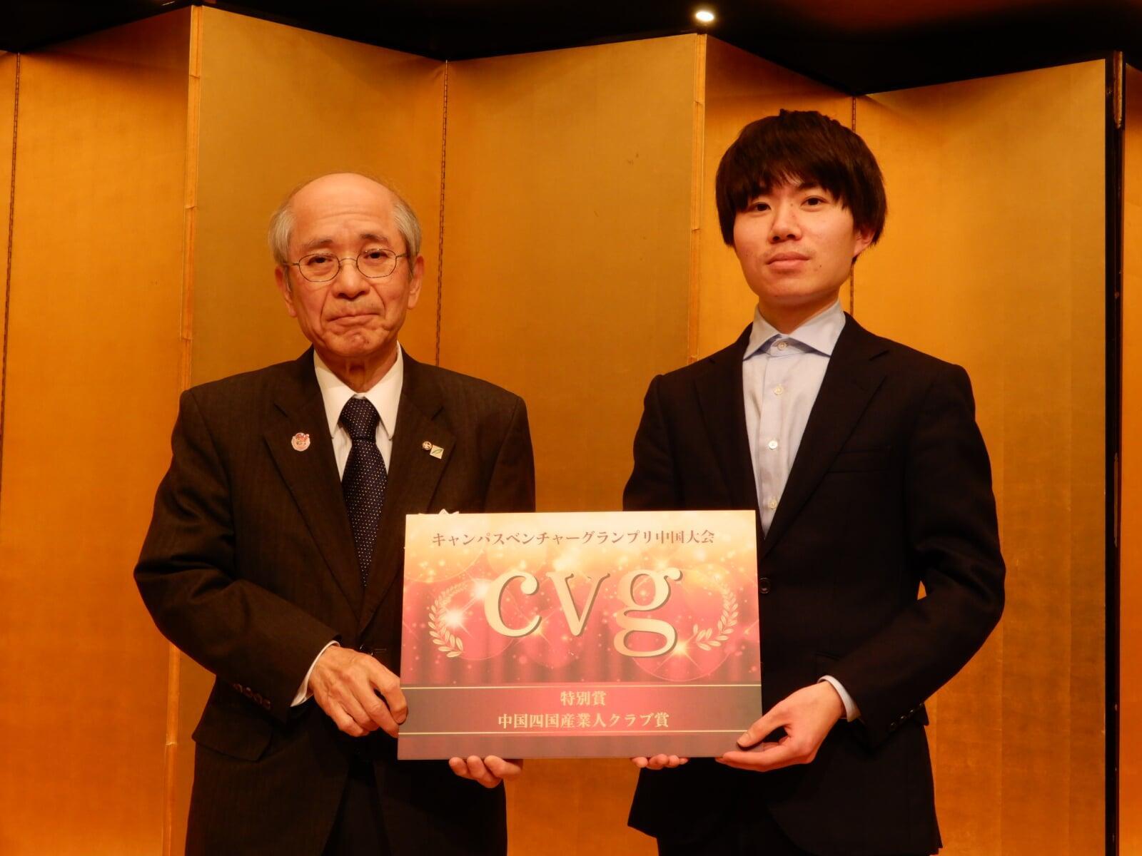 優秀賞・中国四国産業人クラブ賞を受賞した岡山大学の大西さん(右)。左は中国四国産業人クラブの田村特別顧問(広島ガス相談役)