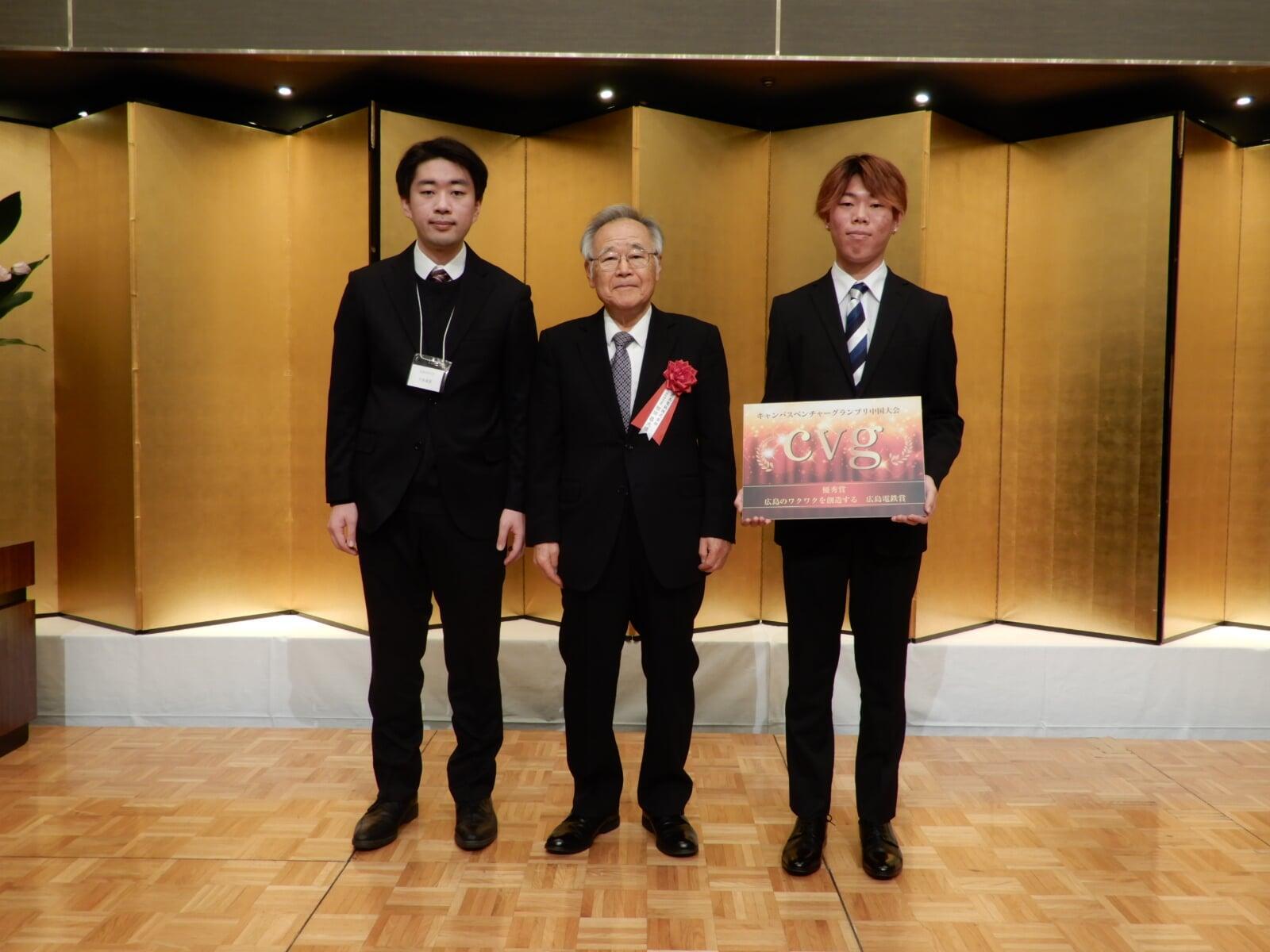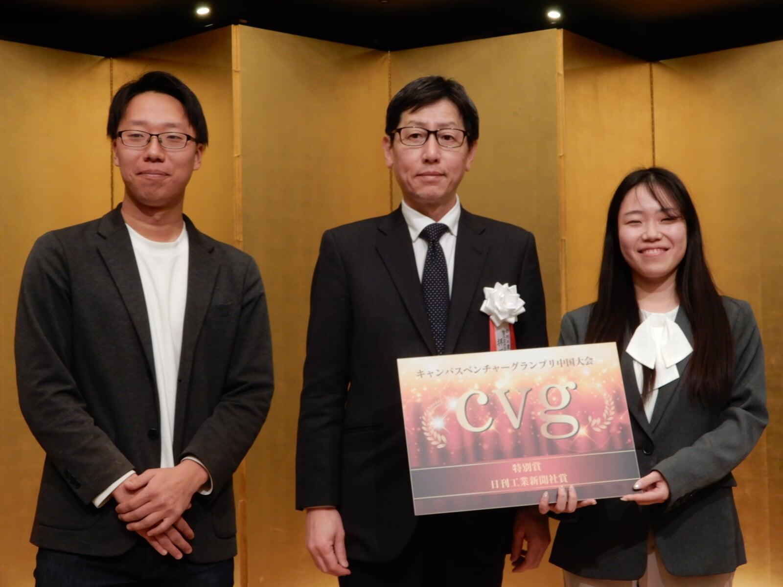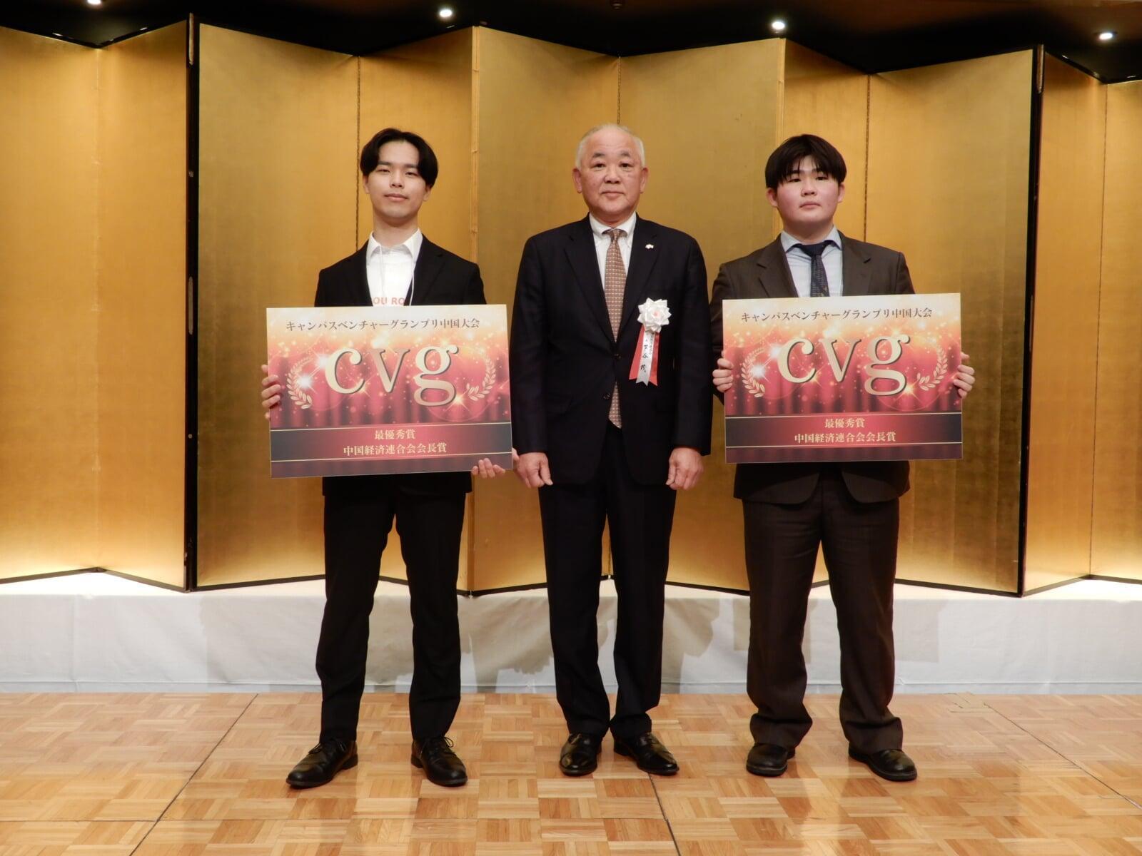 最優秀賞・中国経済連合会会長賞を受賞した岡山大学の伏谷さん(左)と同の森本さん。中央は芦谷茂中国経済連合会会長(中国電力会長)
