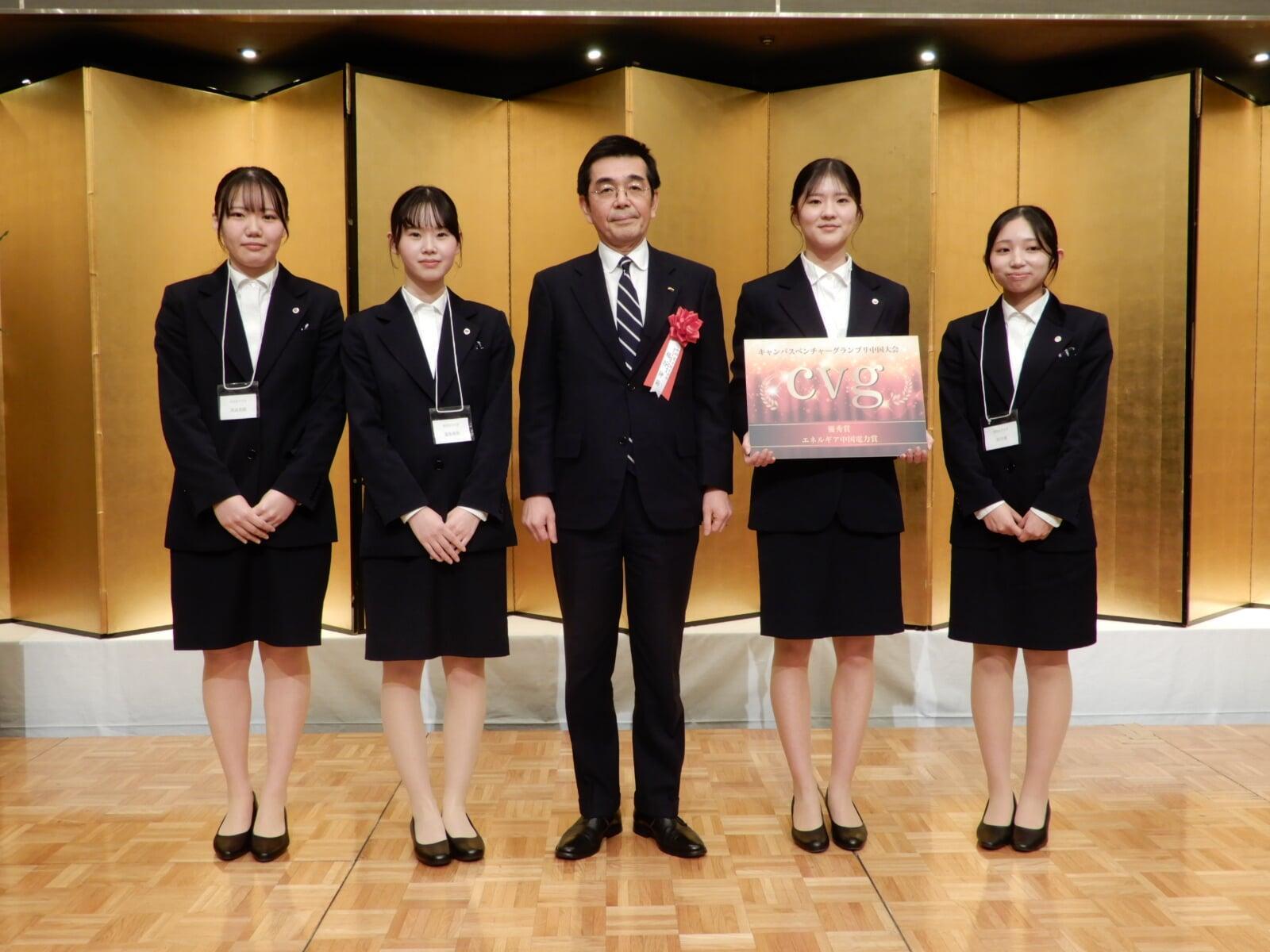 優秀賞・エネルギア中国電力賞を受賞した安田女子大学の佐々木さん(右から2番目)ら。中央は中国電力の福谷執行役員